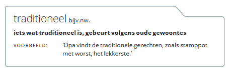 <p type="precedingEmptyLine" fontStyles="bold"> iets wat traditioneel is, gebeurt volgens oude gewoontes</p>