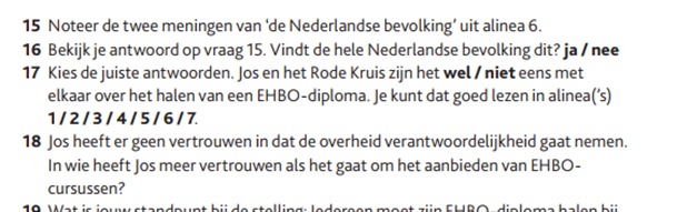 <li><number>17</number> Kies de juiste antwoorden. Jos en het Rode Kruis zijn het <em fontStyles="bold">wel / niet</em> eens met elkaar over het halen van een EHBO-diploma. Je kunt dat goed lezen in alinea(’s) <em fontStyles="bold">1 / 2 / 3 / 4 / 5 / 6 / 7</em>.</li>