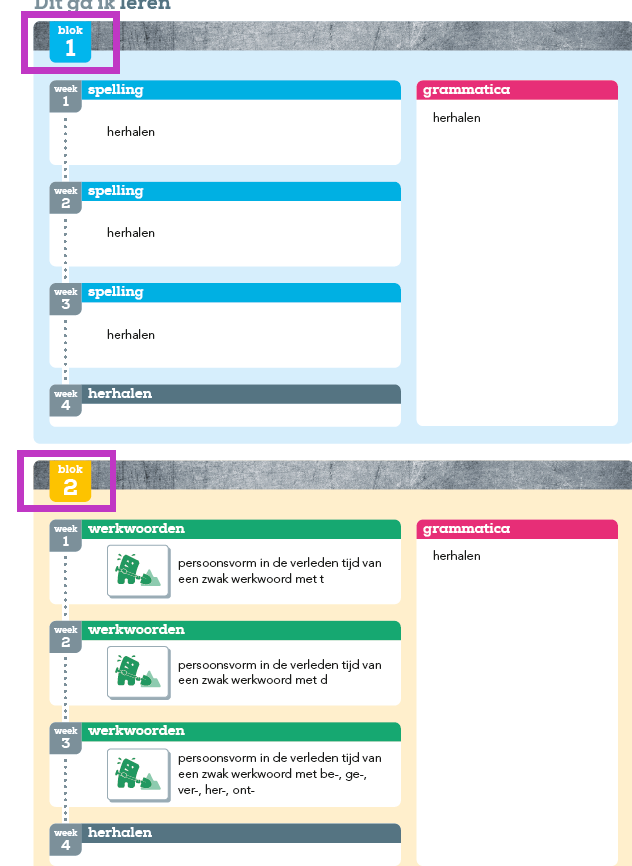 Use the table of contents and the colored pages to determine the structure.