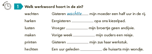 <li>wachten: Gisteren <input type="text" prefilled="wachtte"/> mijn moeder een half uur in de rij.</li>