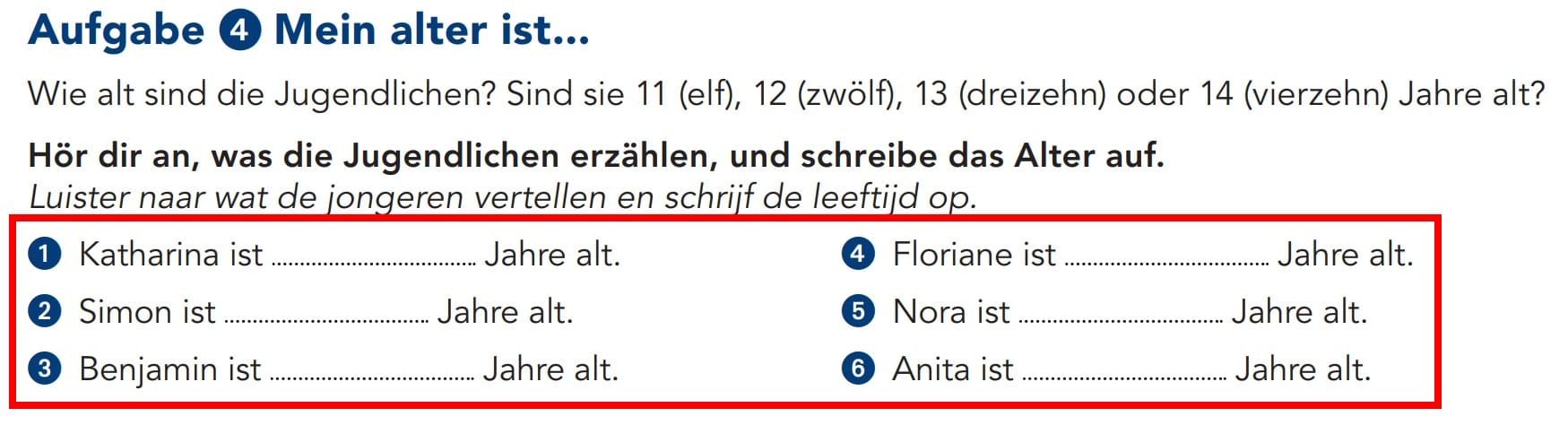 <p fontStyle="bold">Hör dir an, was die Jugendlichen erzählen, und schreibe das Alter auf.</p>